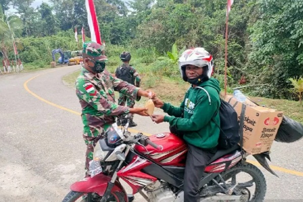 Keerom – Prajurit TNI Satgas Pamtas RI-PNG Yonif Mekanis 512/QY membagikan makanan bergizi bubur kacang hijau kepada warga yang melintas di depan Pos Kalilapar Distrik Waris, Kabupaten Keerom, Papua, dalam rangka memperingati HUT Ke-76 Republik Indonesia.