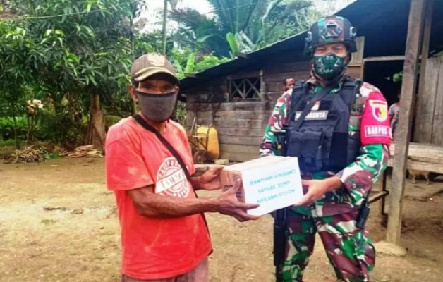 Keerom – Personel TNI Satuan Tugas Pengamanan Perbatasan RI-PNG Yonif Mekanis 512/QY membagikan paket sembako di tengah pandemi COVID-19 kepada warga di perbatasan Kampung Sach dan Kampung Kalilapar 2, Distrik Waris, Kabupaten Keerom, Papua.