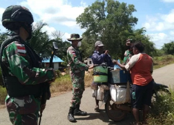Merauke – Prajurit TNI Satgas Pamtas RI-PNG Yonif 611/Awang Long membagikan bantuan sembako kepada warga di perbatasan, di Kampung Kweel, Kabupaten Merauke, Papua, dalam upaya membantu kesulitan masyarakat terdampak COVID-19.