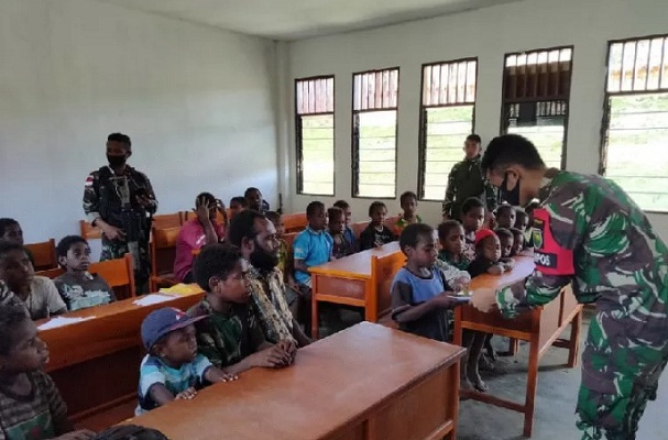 “Saya mewakili seluruh murid dan para guru yang ada di sekolah ini mengucapkan banyak terima kasih kepada bapak-bapak TNI yang telah meluangkan waktu untuk berkunjung ke sekolah kami dengan memberikan pengarahan dan materi wawasan kebangsaan serta memberi bantuan alat tulis kepada murid di sekolah kami,”ujar guru Kotius Tabuni.